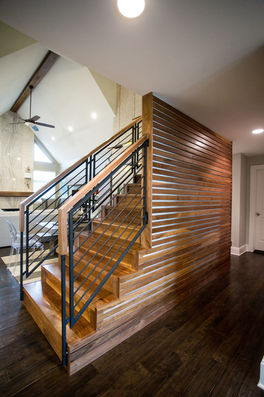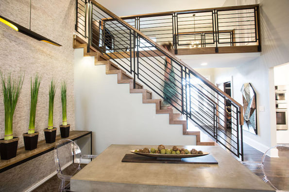 This home renovation included the fabrication of a 3-dimensional wooden feature wall in the master bedroom, a custom-built staircase, and a one-of-a-kind dining room table.