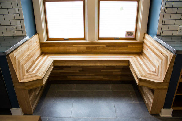 This kitchen remodel features a custom window bench and butcherblock island made from reclaimed materials, and modern stainless steel shelving to complete the industrial look.